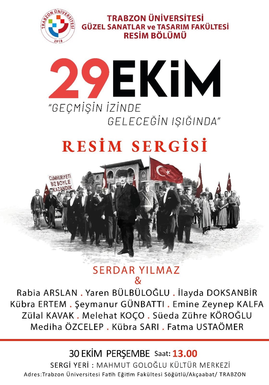 Trabzon Üniversitesi Mahmut Goloğlu Kültür Merkezi'nde, 30.10.2025 tarihinde saat 13.00 'da, Fakültemiz akademisyenlerinden Öğr. Gör. Dr. Serdar YILMAZ ve atölye öğrencilerinin çalışmalarından oluşan 29 Ekim "Geçmişin İzinde Geleceğin Işığında" başlıklı resim sergisi açılışı gerçekleştirilecektir.